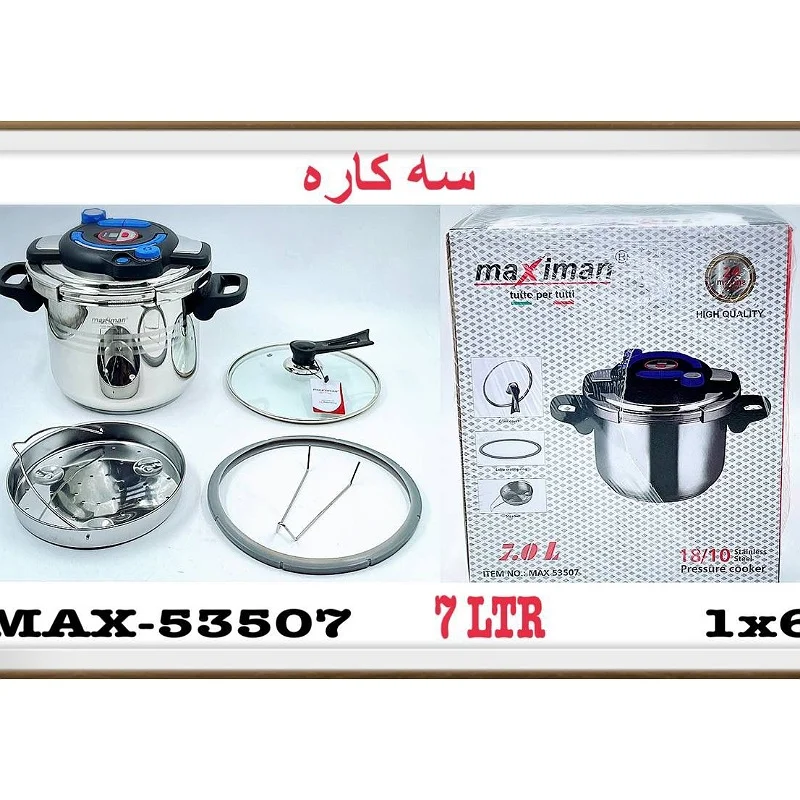 زودپز رو گازی درب کلیپسی تایمر دار ماکسیمان مدل MAX-5350۷ ، ظرفیت سایز بزرگ ۷ لیتر مناسب خانواده کم جمعیت تا پر جمعیت ، استیل ۱۸/۱۰ با کیفیت ترین نوع استیل در دنیا درب تاشو ، درب کلیپسی جدید که دکمه قفل و باز دارد ، فوق باکیفیت ، دارای سوپ اطمینان ، تایمر دار ، دارای سری شیشه برا پلوپز و دارای توری بخارپز .