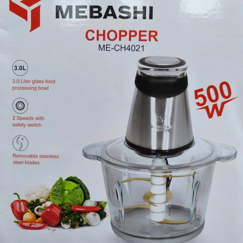 مشخصات خردکن 3لیتری جدید برند مباشی تیغه فولادی طلایی مد4021 ME-CH: برق و ولتاژ:230 ولت /50 هرتز /500 وات دوسرعته با کلید ایمنی موتور کم صدا و روان کاسه شیشه 3 لیتری بسیار با کیفیت 6 پره تیغه های فولادی ضد زنگ
